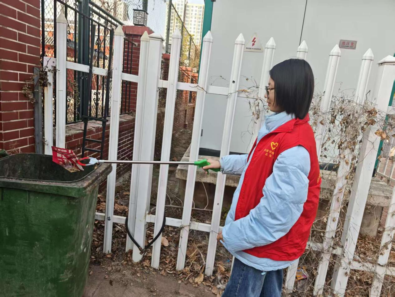 活动当天,志愿者们整装集结,携垃圾夹、分类垃圾袋等工具,满怀热忱奔赴重庆路小学。在牟欣媛同学的统筹引导下,团队明确分工,先集中清运大型杂物,再逐片排查清扫零散垃圾,同时按照分类标准进行垃圾分拣。志愿者们以俯身拾捡的姿态将杂乱环境归置井然。以默默付出的坚守让公益暖意浸润街巷中。