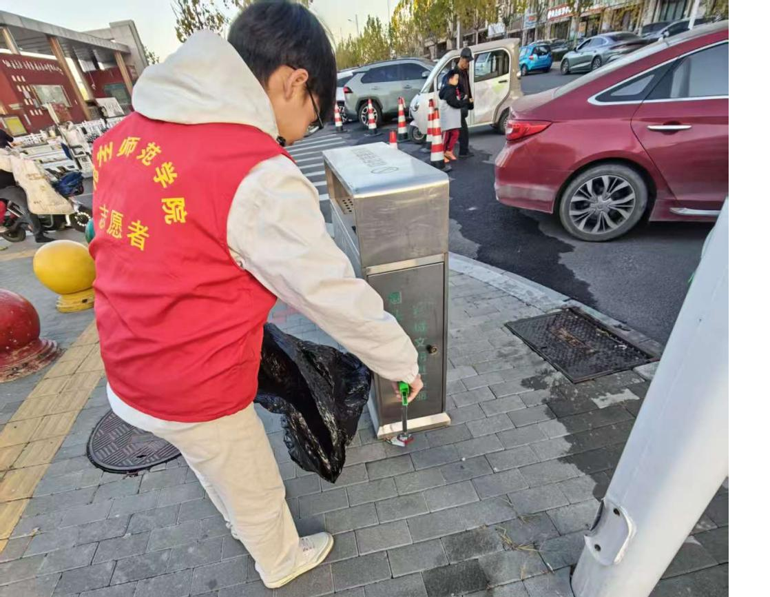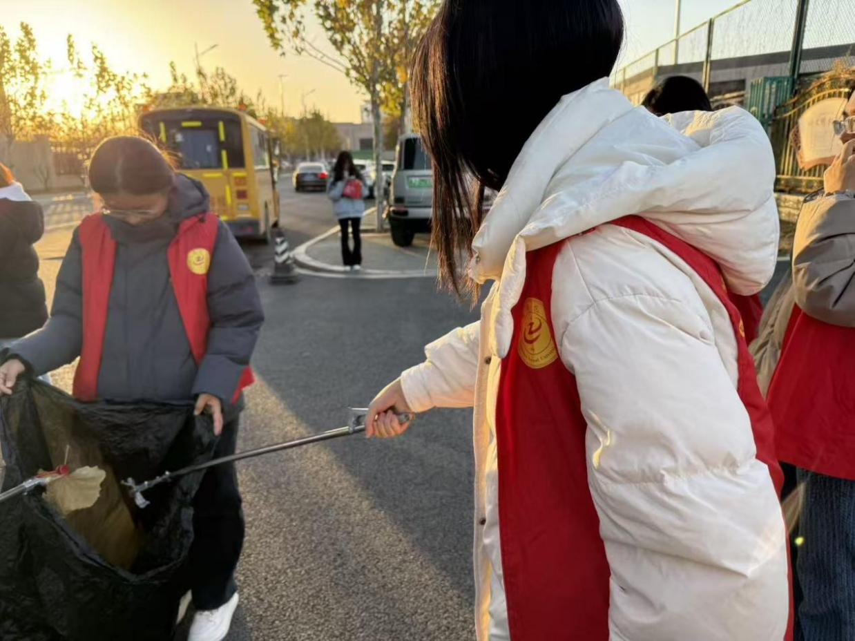 志愿者们在学院楼下列队集结。牟欣媛同学统一分发垃圾夹、分类垃圾袋等清洁工具,并清晰明确了任务分工:一组负责清理广州路小学周边公交站点的落叶与杂物,另一组则专注于清扫学校门口至公交站沿线盲道的落叶。同时,她强调了安全问题:清扫过程中需避开上学时段的学生人流及过往车流;使用垃圾夹时务必轻夹轻放,避免损伤公共设施;确保清扫工作既保证质量,又不影响道路通行安全。