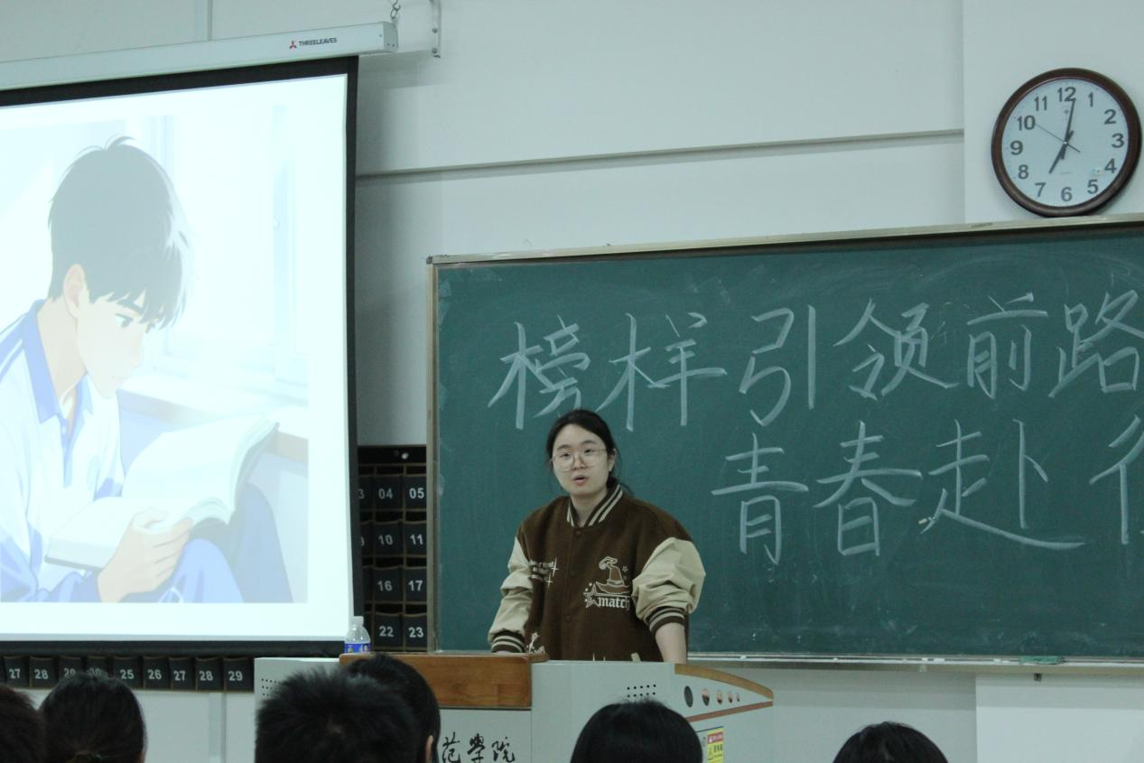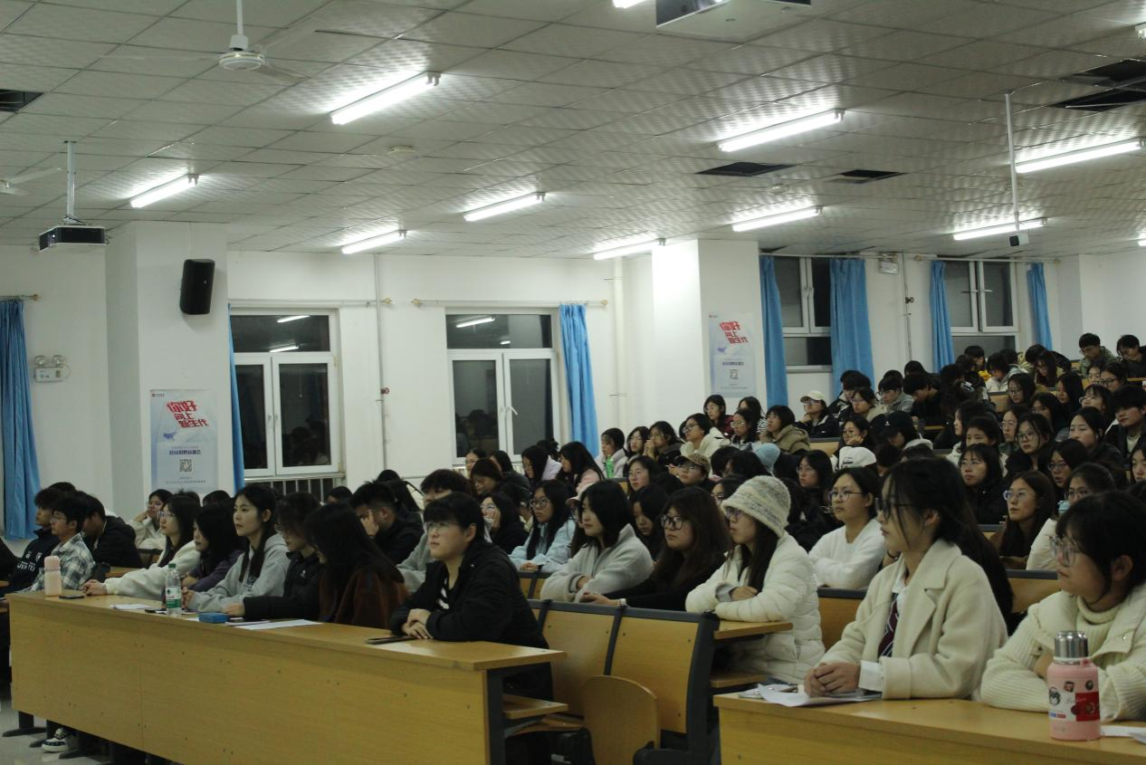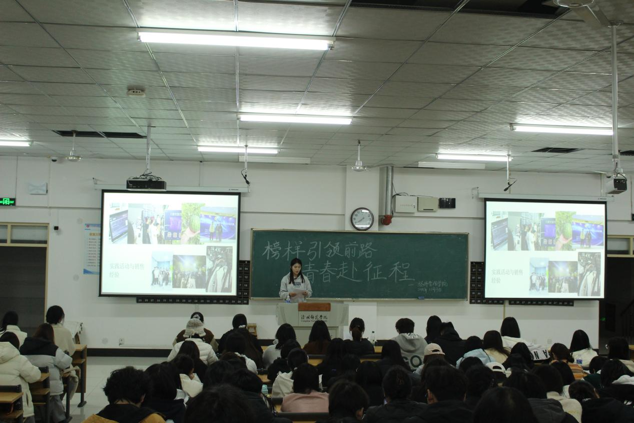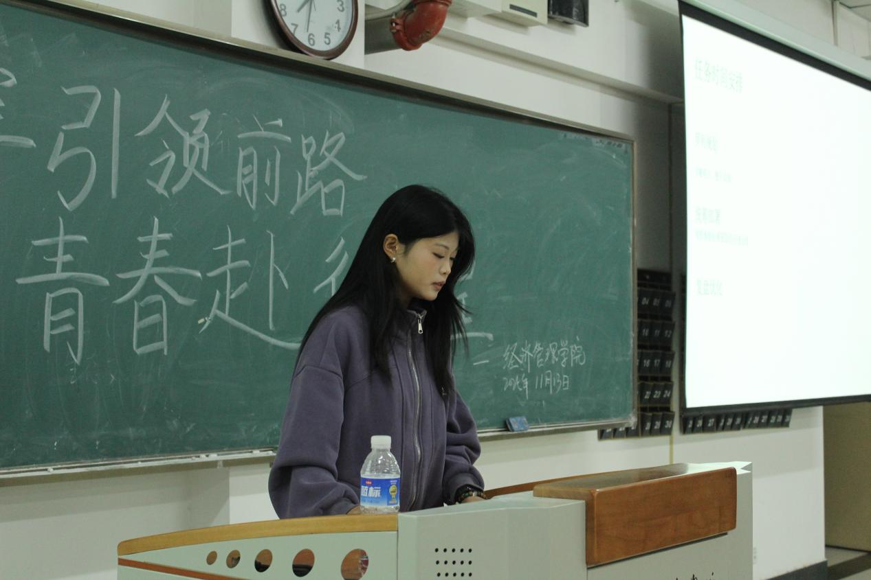 为解决大一新生在学业规划、竞赛参与、学业与学生工作平衡中的困惑,传递优秀学子实用经验,帮助新生快速适应大学生活、明确成长方向,激发青年学子的奋斗热情与实干精神,经济管理学院于2025年11月13日在齐越楼四阶梯召开榜样经验分享会。本次大会由团总支副书记郑悦主持,分享人有国家奖学金获得者耿碧瑶和代晓余同学、竞赛学生代表梁竞文和张淑慧、优秀学生干部沈金梅、万雨鑫和樊绍菲同学。