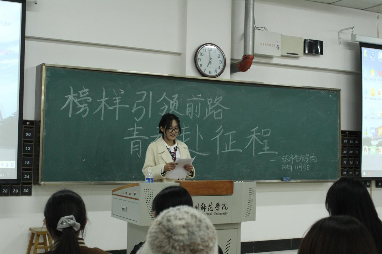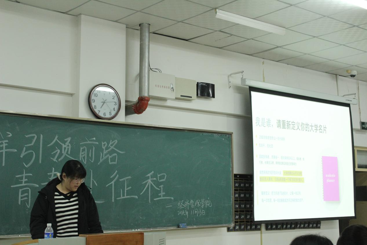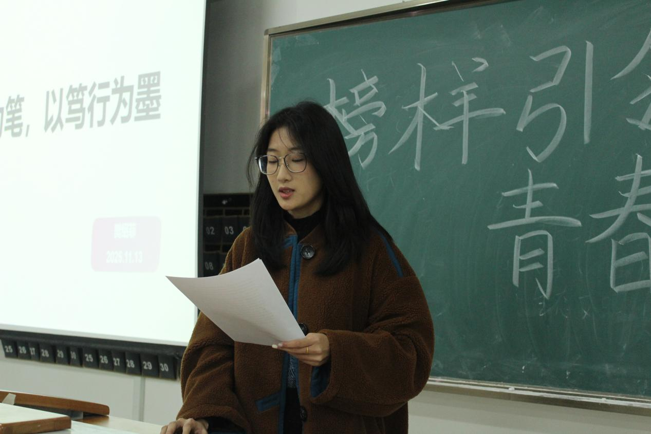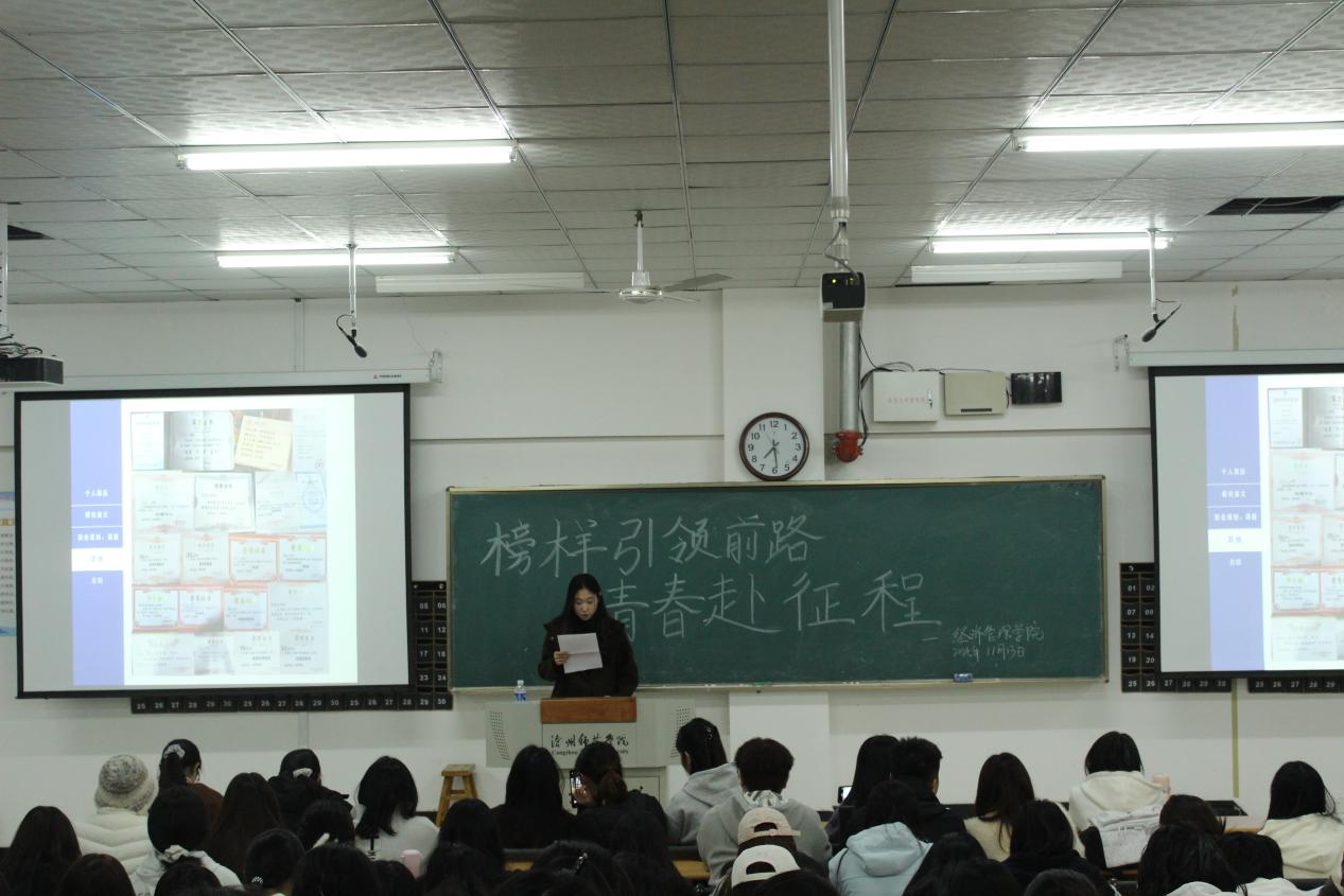 为解决大一新生在学业规划、竞赛参与、学业与学生工作平衡中的困惑,传递优秀学子实用经验,帮助新生快速适应大学生活、明确成长方向,激发青年学子的奋斗热情与实干精神,经济管理学院于2025年11月13日在齐越楼四阶梯召开榜样经验分享会。本次大会由团总支副书记郑悦主持,分享人有国家奖学金获得者耿碧瑶和代晓余同学、竞赛学生代表梁竞文和张淑慧、优秀学生干部沈金梅、万雨鑫和樊绍菲同学。