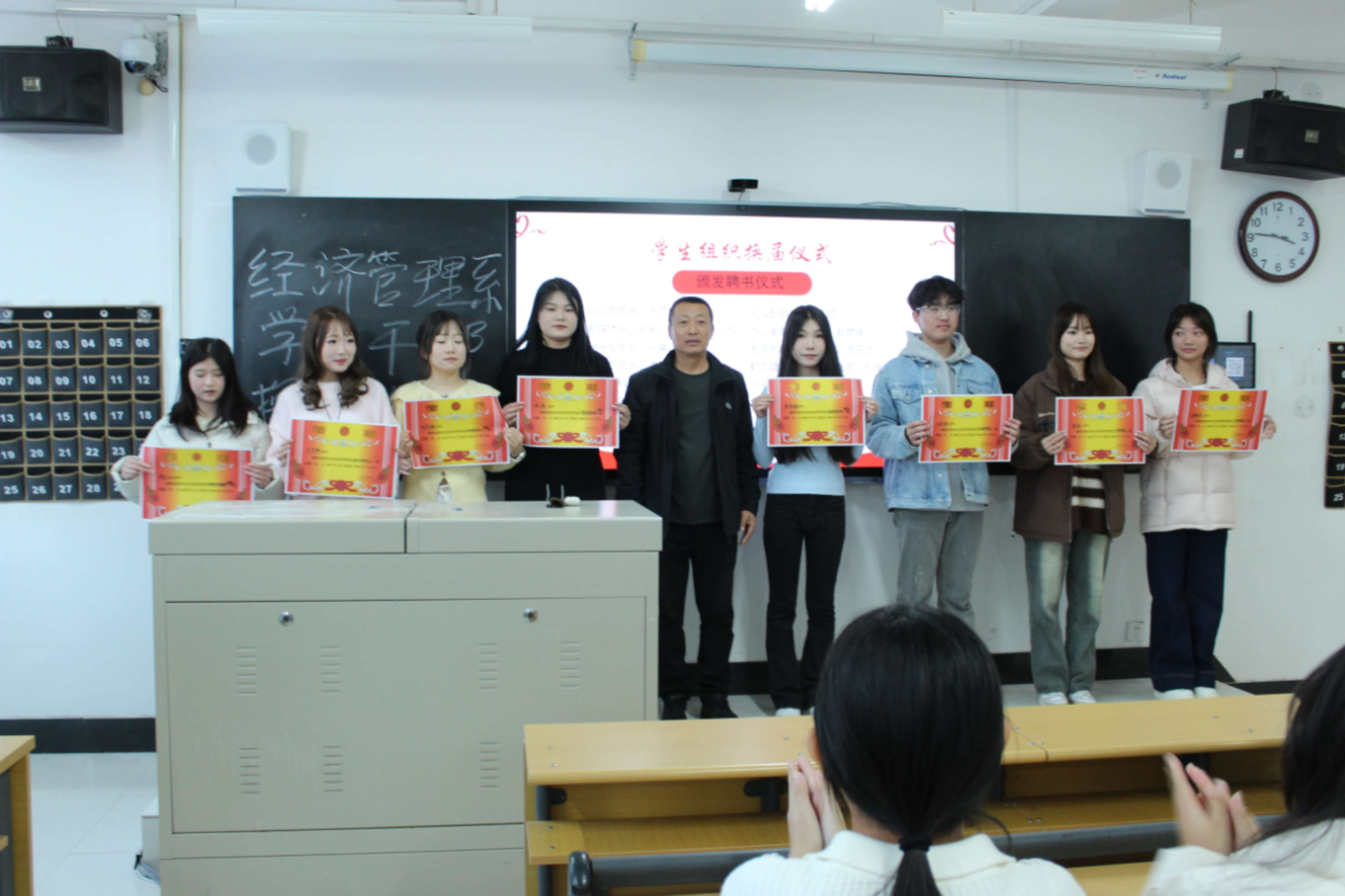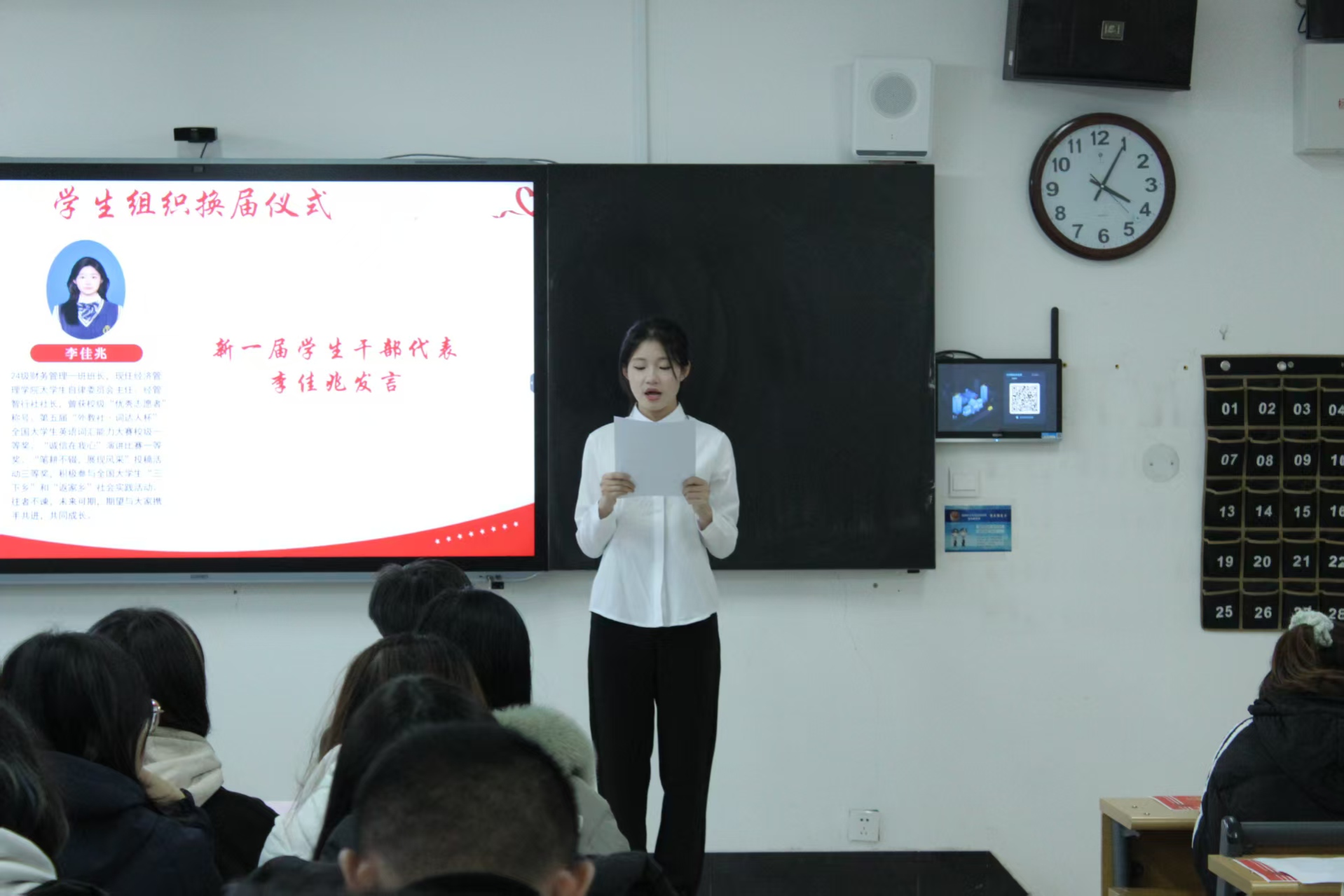 为完成学生组织薪火交接、传承往届干部工作经验与服务精神,凝聚学生组织的向心力与战斗力,强化学生干部的责任担当与服务意识,规范学生工作的运行机制与执行流程,搭建干部成长成才的实践平台与交流桥梁,提升学生工作的质量效能与育人实效,推动学院学风建设,经济管理学院于2025年11月18日下午,在齐越楼502教室隆重召开2025届学生干部换届大会。经济管理学院书记张金峰、院长李建忠,22级辅导员贾坤老师、23级辅导员尹美娟老师、24级辅导员李琳老师出席本次换届大会。本次大会由李琳老师主持。