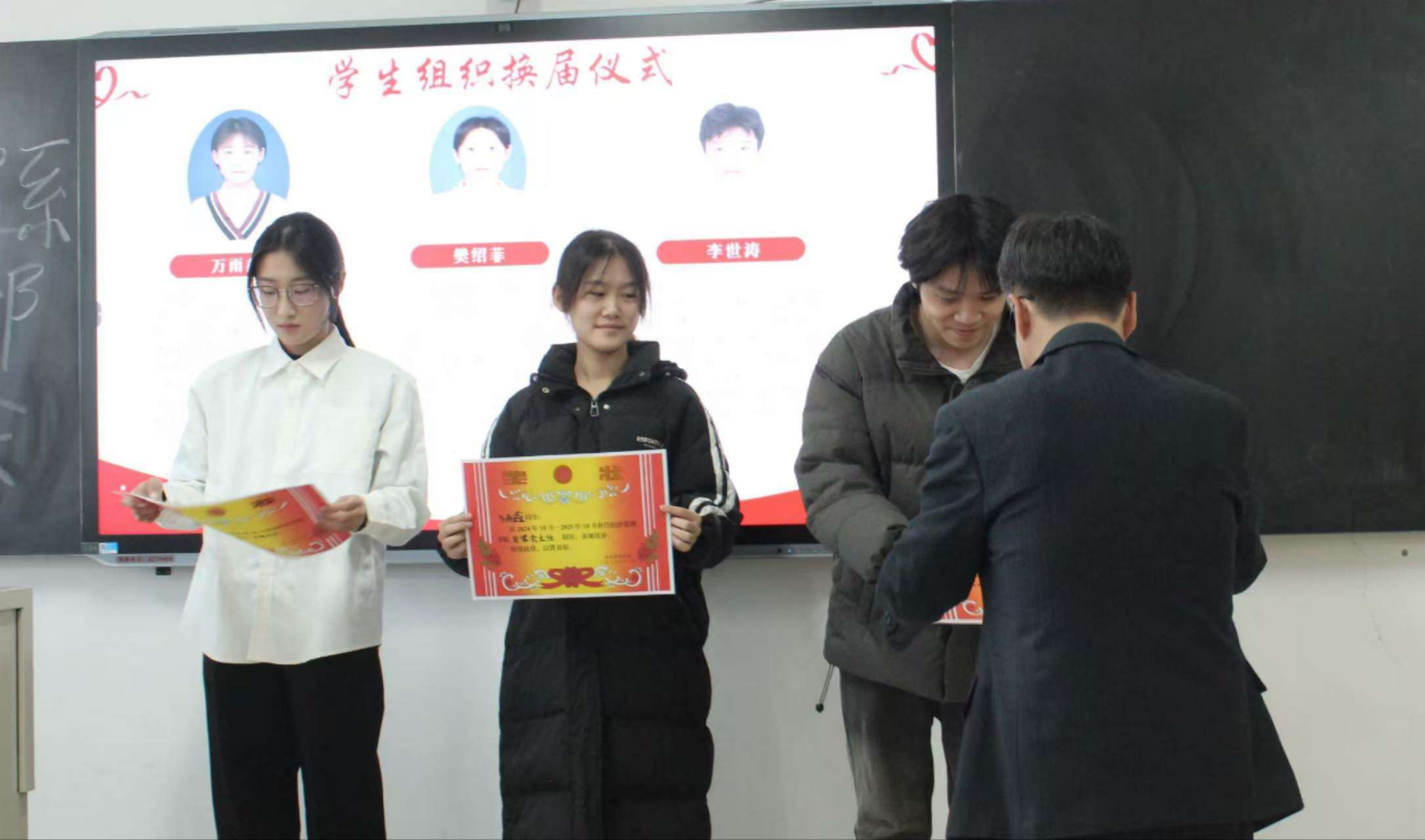 大会第二项,学生组织换届聘任环节有序推进。党总支书记张金峰亲手将聘书交到每位新任干部手中,指尖传递的不仅是厚重的文书,更是沉甸甸的使命与嘱托,一纸聘书承载着学院的信任与同学的期待,既象征着责任的交接,也寓意着新征程的开启,标志着新一届学生干部正式走上服务岗位。