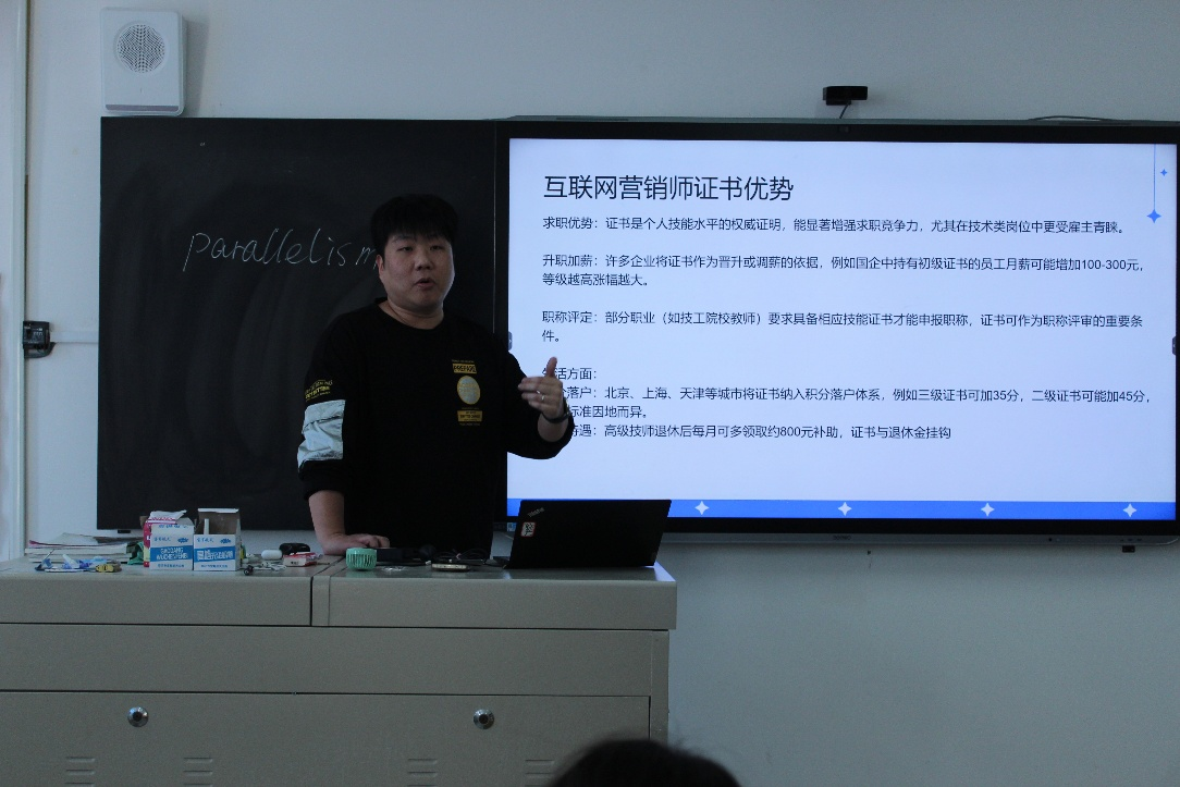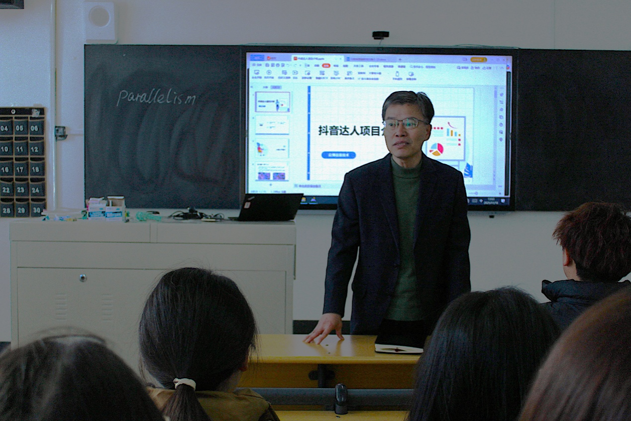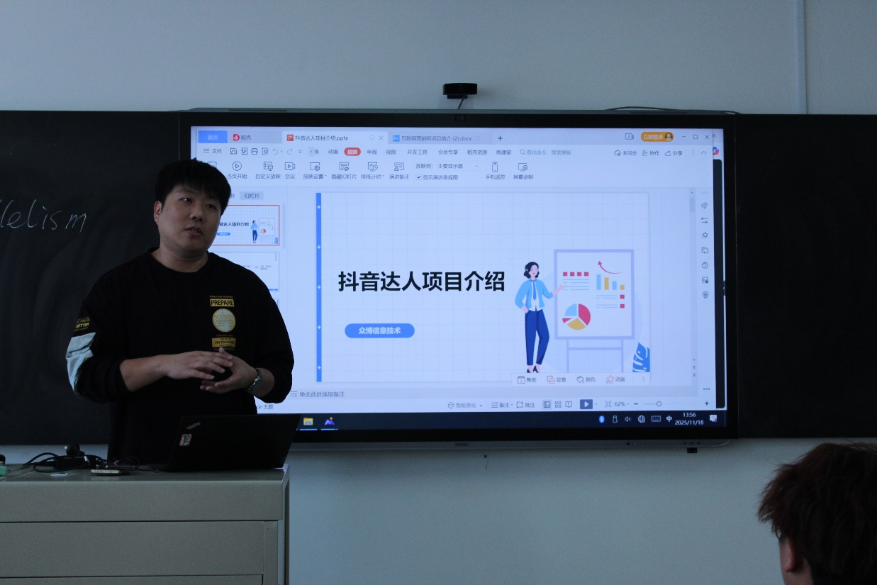 随后,众博公司代表展开主题分享。其从企业概况切入,详细介绍了公司2014年成立以来深耕电商运营的发展历程、核心团队优势及业务布局,让同学们对行业标杆企业的运作模式有了直观认知。针对行业趋势,代表以抖音日活数据为切入点,深刻剖析了电商行业的巨大市场潜力与激烈竞争格局,系统拆解了情景短剧带货、评测推荐带货、知识科普带货等主流变现形式,引导同学们正视行业挑战、找准发展方向。
